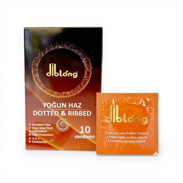 DIBLONG Dotted & Ribbed sunt prezervative concepute pentru a oferi atât protecție sigură, cât și stimulare suplimentară în timpul actului sexual. Textura specială, cu puncte și nervuri, intensifică senzațiile pentru ambii parteneri, în timp ce materialul din latex natural asigură confort și flexibilitate pe durata utilizării.