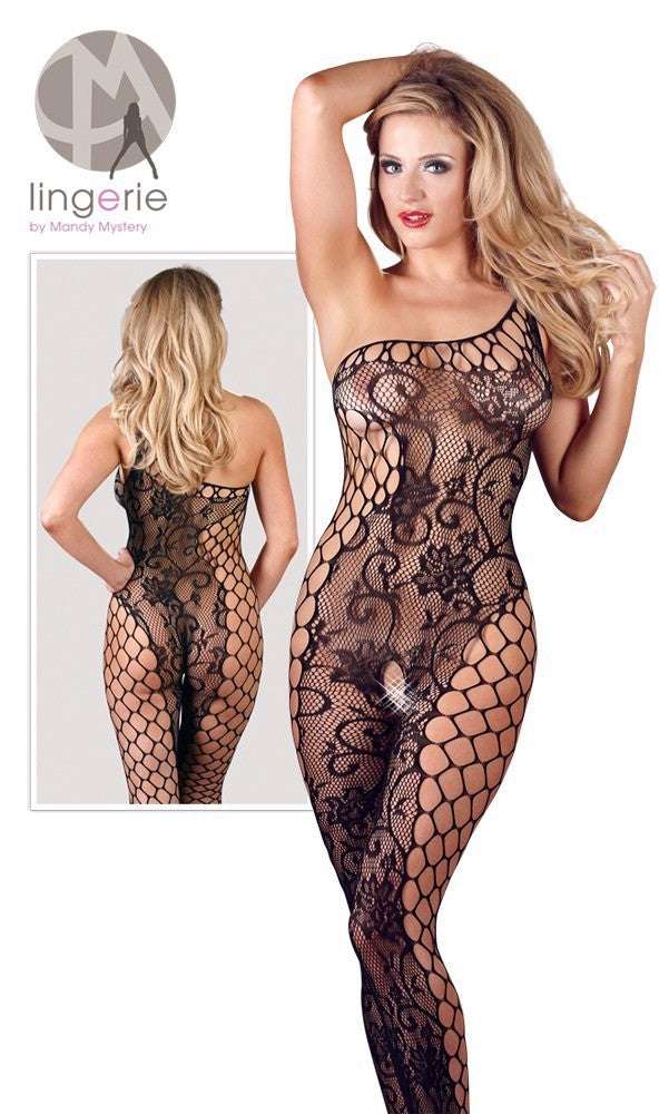 Bodystocking asimetric – catsuit sexy din plasă cu dantela si decupaje provocatoare S-L, negru