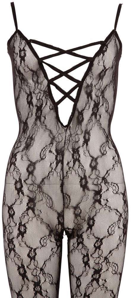Bodystocking – catsuit sexy din plasă cu dantela si decolteu provocator 2XL/3XL, negru