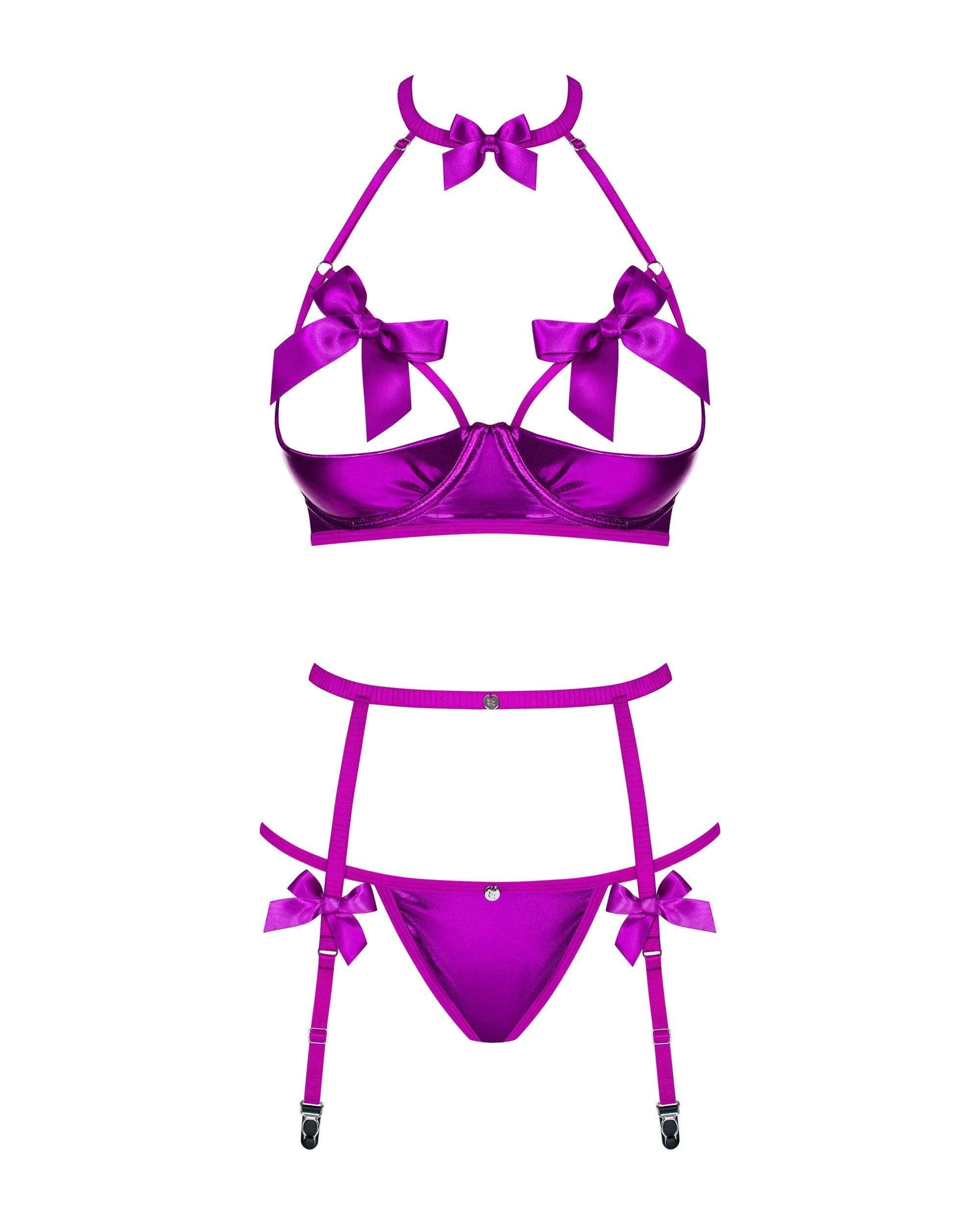 Descopera magia seductiei in nuante vibrante de mov cu setul Delishya, o lenjerie erotica premium de la Obsessive ce combina eleganta cu latura jucausa. Alaturi de sustinerea delicata si designul sofisticat, acest set format din 3 piese (sutien, chiloti tanga si portjartier) promite sa transforme orice seara intr-un moment special. Funditele discrete si contrastele de culoare pun in valoare silueta, oferind un look jucaus, dar sofisticat.