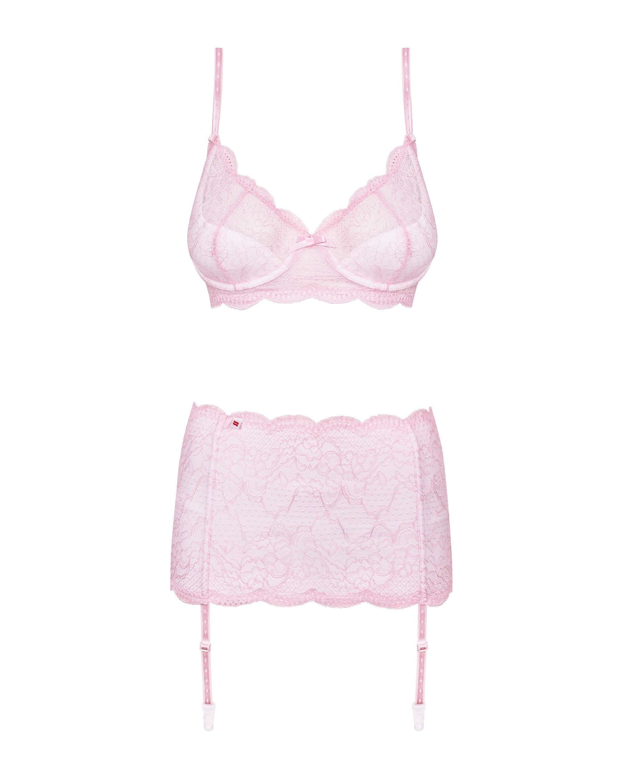 Set de lenjerie intimă Girlly - compleu sexy cu sutien, chiloți și portjartier din dantelă S/M, roz